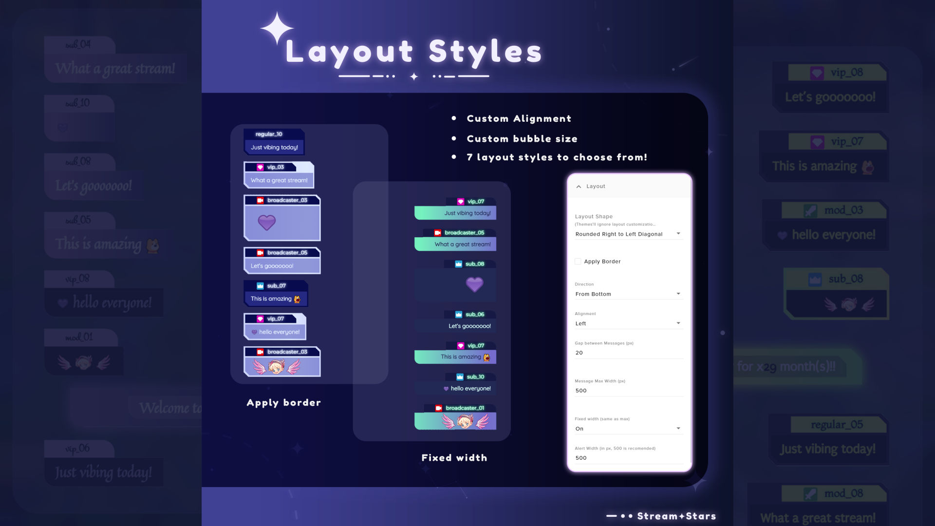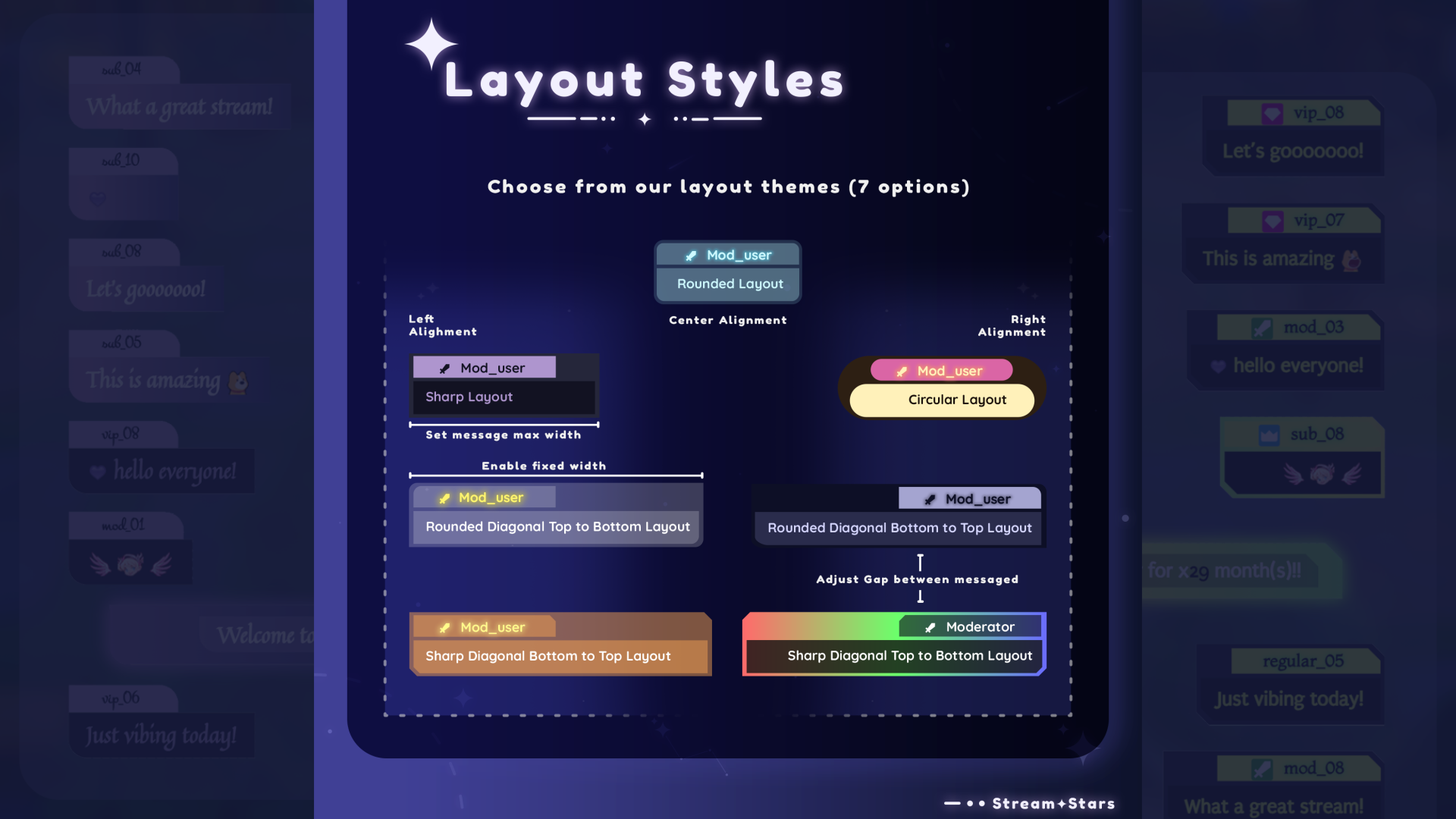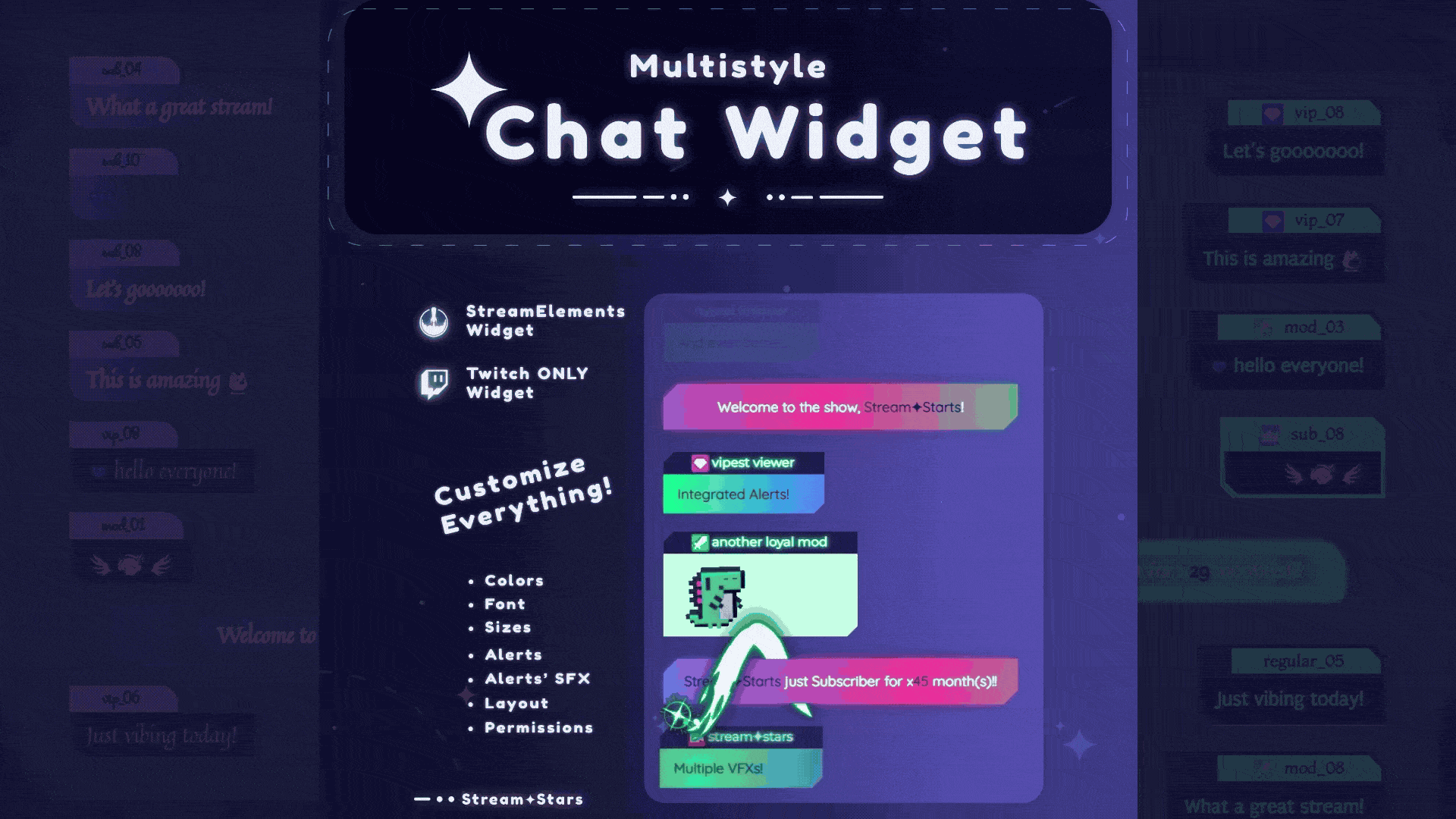 A flexible, lightweight chat box with multiple styles. Customize colors, layout, and animations. Includes integrated alerts for live events.