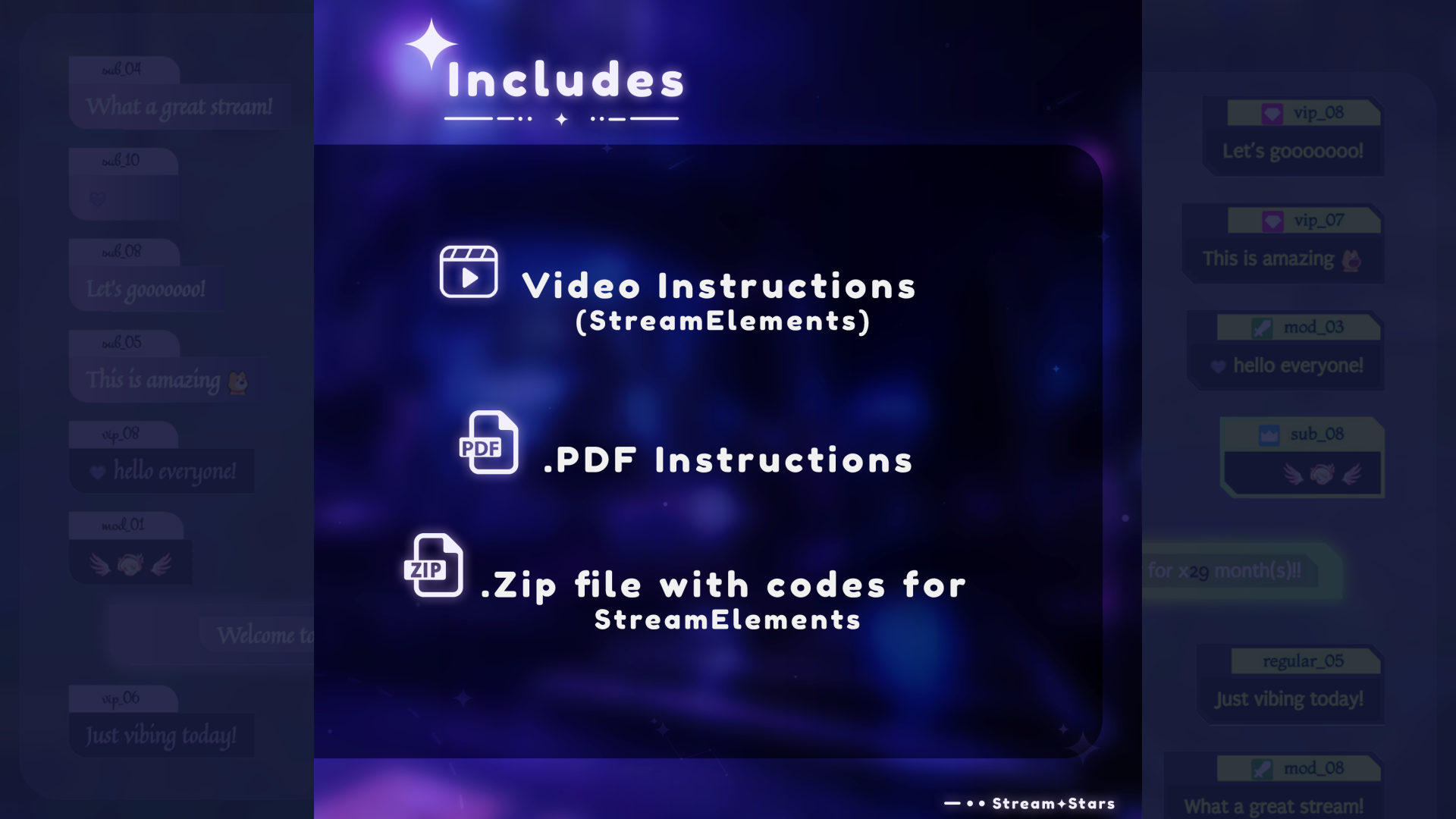 - .zip file with StreamElements widget code: HTML, CSS, JS, Custom Fields, and Data